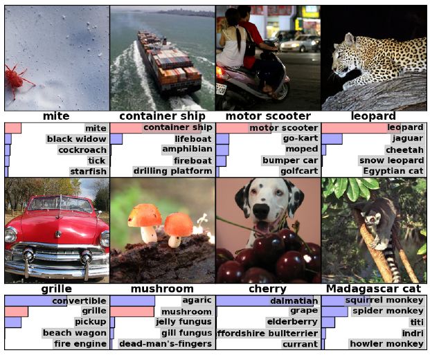 AlexNet 在 ILSVRC 2010 八张测试集图片上的识别效果: