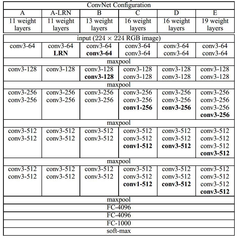 在论文中,作者使用了 A-E 五个不同深度水平的卷积网络进行试验,从A到E网络深度不断加深,网络的具体信息如下: