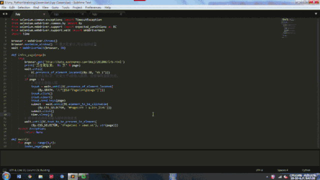 这里,我们先加载了相关包,使用WebDriverWait对象,设置最长10s的显式等待时间,以便网页加载出表格。判断表格是否加载出来,用到了EC.presence_of_element_located条件。表格加载出来后,设置一个页面判断,如果在第1页就等待页面加载完成,如果大于第1页就开始跳转。