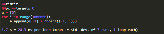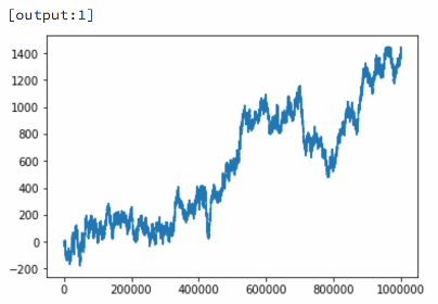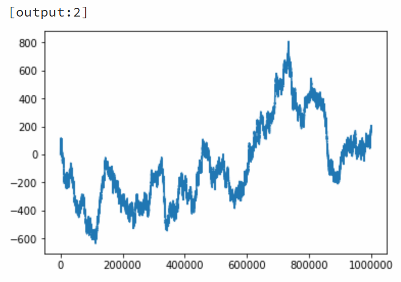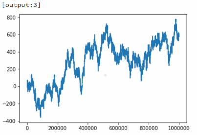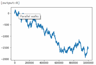 接下来的两个代码块计算一个具有一百万步的2D随机游走。它们都由%% timeit magic命令装饰,用于计算算法次数。第一个单元使用--targets参数将计算限制为单个核心上的单个进程(核心“0”; 我们可以选择0到3之间的任何数字); 第二个使用%% px表示使用所有核心。注意,在这种并行计算方式中,每个变量(包括每个列表)都在核心之间进行复制。这与NumPy中的数组计算形成对比,NumPy中的数组在核心之间分配,每个核心都处理一个较大问题的一部分。而在此示例中,每个核心将单独的计算所有百万步随机游走。