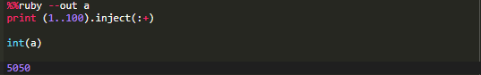 下图,是一个Jupyter notebook片段,以最简单的方式体现了多语言功能。%% ruby 这个magic命令(双%%表示magic命令将应用于整个代码块)使得代码块的内容由Ruby解释器处理。--out标志将代码块的输出存储到命名变量中,并且这个全局变量可用于其他基于Python内核的代码块。接下来代码将Ruby的字符串输出转换为整数(注意,int()是合法的Python函数,但不是Ruby函数)。Ruby代码简单地将整数从1加到100;最终结果存储在a中。