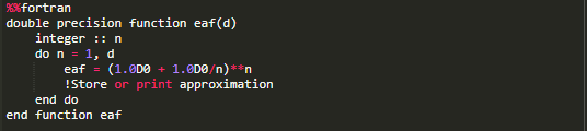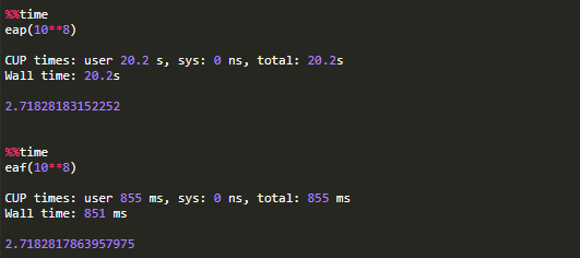 下图显示了该过程。首先,定义一个名为eap()的python函数,该函数用于收敛到自然数e,它计算d个连续近似值,最后返回结果。接下来加载Fortran magic,这将生成一个用户警告(已折叠省略),因为这是为旧版本的IPython / Jupyter开发的(但一切仍然有效)。load命令定义我们在之后代码块中使用的代码块magic,这个代码块是一个相同功能的Fortran函数,称为eaf()。执行该代码块时,IPython会编译代码并生成Python接口。最后两步,在打开定时的情况下调用这两个程序,输出两个程序的执行时间,明显Fortran版本的速度提高了大约24倍。
