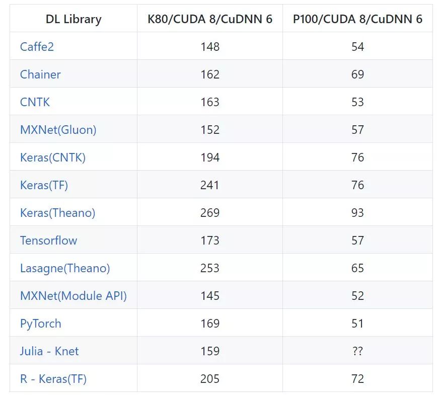 如下展示了在 IMDB 数据集上训练门控循环单元(GRU)的速度,它们实现的是情感分析任务。对于循环神经网络,PyTorch 和 TensorFlow 的性能差不多,不过 PyTorch 在 P100 芯片上普遍表现得比 TensorFlow 好。