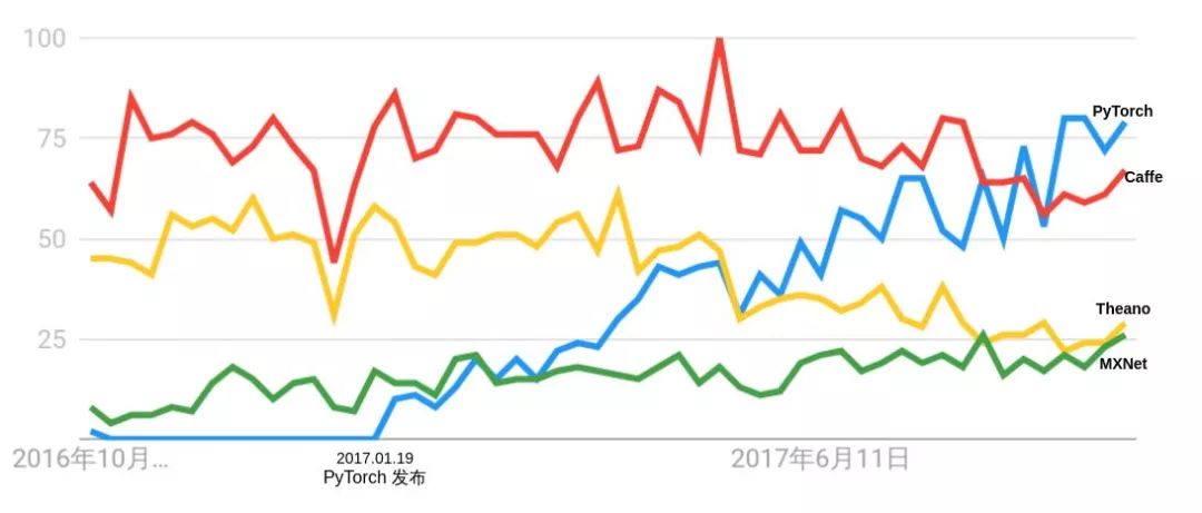 图 1 PyTorch 和 Caffe、Theano、MXNet 的 Google 指数对比(类别为科学)