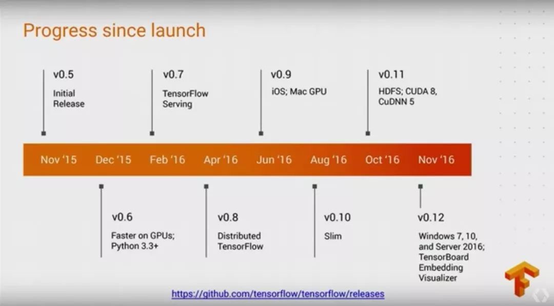 2015年11月10日,Google宣布推出全新的机器学习开源工具TensorFlow。 TensorFlow 最初是由 Google 机器智能研究部门的 Google Brain 团队开发,基于Google 2011年开发的深度学习基础架构DistBelief构建起来的。TensorFlow主要用于进行机器学习和深度神经网络研究, 但它是一个非常基础的系统,因此也可以应用于众多领域。由于Google在深度学习领域的巨大影响力和强大的推广能力,TensorFlow一经推出就获得了极大的关注,并迅速成为如今用户最多的深度学习框架。