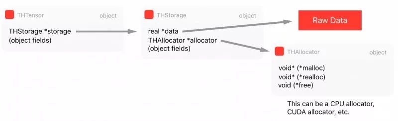 该约定同样存在于函数/类别名和其它对象中,因此了解它们十分重要。你可以在 TH 代码中找到 CPU 分配器,在 THC 代码中找到 CUDA 分配器。最后,我们可以看到主张量 THTensor 结构的组成: