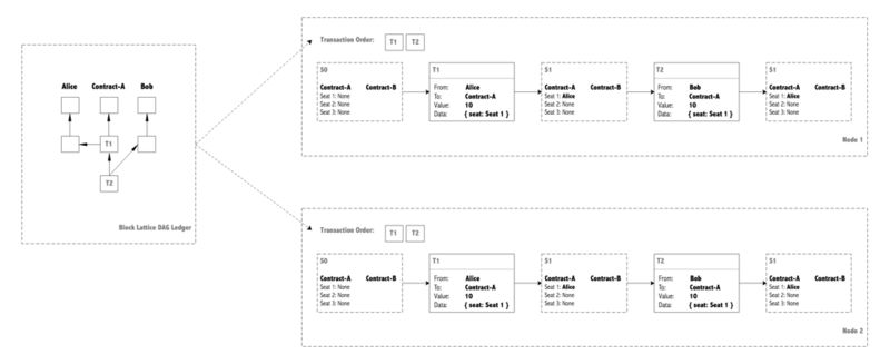 谈完了加密货币,我们再来看看智能合约。在现实世界中,很多应用场景不像加密货币那样只记录一个余额就足够了。例如飞机票预订应用,在状态中需要记录一个航班上每一个座位的归属。这个时候,交易也不再仅仅表示转账了,可能包含任何对智能合约的请求数据,例如一张机票的预订请求。这个时候,改变两个交易的先后顺序,就有可能产生不同的状态。想想看,如果 Alice 和 Bob 都尝试去预订同一班飞机上的同一个座位,那么这个座位将归属于先预订的那个人。在智能合约的场景下,好运气终结了,交易之间不再完全满足交换律了。这就迫使我们不得不去认真对待账本中每个交易之间的顺序。