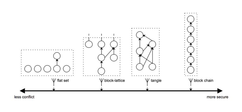而 DAG 是在区块链的基础上扩展出来的另外一种账本结构。在 DAG 账本中,一个区块通常只包含一个交易,它们彼此之间通过哈希引用,构成一种有向图结构,并且保证图中不存在环路。DAG 账本有很多不同的变体。例如,任意一个交易均引用两个其他交易作为其前驱节点,所构成的 DAG 被称为“Tangle”,应用于 IOTA 等项目;在另外一种 DAG 结构中,交易被组织成若干条链,并通过一些成对的交易彼此链接,这种 DAG 被称为“Block Lattice”,应用于 Nano、Vite 等项目。