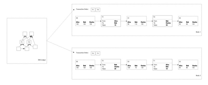 我们在来看看 DAG 账本,是不是还具有这样的特性。好运气还在,在 DAG 账本中,虽然一些交易之间的顺序从账本中已经获取不到了,但这些顺序并不影响节点计算状态。因为加密货币中的状态计算,都是对余额的加减运算,这些运算是满足交换律的,只要保证任何账户的余额不小于 0,交易的先后是无所谓的。因此,无论如何遍历 DAG 账本,最终计算的账户余额数据都一样,也就是说,任何节点都可以通过 DAG 账本来恢复正确的状态。