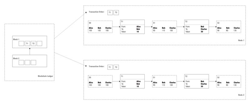 那么问题来了,假如每个节点拿到的账本是完全一样的,那么根据这个账本计算出来的状态是否也完全一样呢?首先来看区块链这种结构。在这种结构中,所有的交易都是有序的,改变任何两个交易的顺序,都会破坏区块链的哈希引用关系,从而破坏账本的有效性。因此,无论在哪个节点上进行计算,从同一个初始状态出发,经历同样的转账交易序列,总会产生相同的结果。非常完美,不是吗?无论是比特币还是以太坊,节点之间不需要传输和比较庞大的状态数据,只需要就账本数据达成共识就行了。账本中所包含的信息,就足够一个节点计算出正确的状态了。