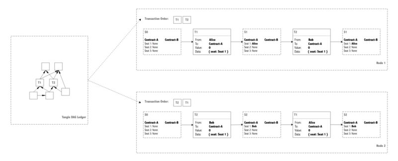 基于这样的账本结构,你会发现,世界又恢复了秩序。无论以什么样的顺序遍历 DAG 账本,只要遵循账本中记录的交易顺序,总可以计算出同样的世界状态。这也是 Vite 项目选择这种结构作为账本的原因。而采用 Tangle 结构实现智能合约,就必须引入另外一套排序规则。这在逻辑上相当于在原来 DAG 结构之外,针对同一组交易,另外建立一个不同的 DAG 结构,专门服务于智能合约,增加了工程实现上的难度。