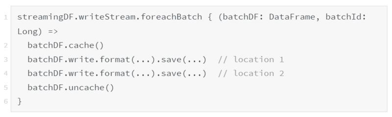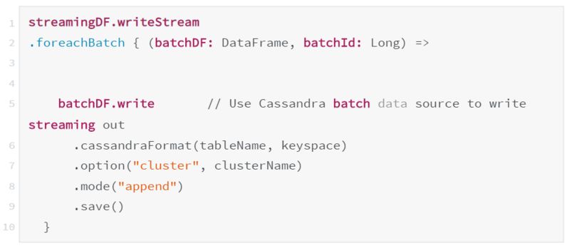 很多外部存储系统已经提供了批次连接器,但并非所有外部存储系统都有流式接收器(sink)。在新版本中,即使存储系统不支持流式接收器,仍然可以通过 streamingDF.writeStream.foreachBatch(…) 在每个微批次输出上使用批次数据写入器。例如,你可以在 foreachBatch 中使用现有的 Apache Cassandra 连接器直接将流式查询的输出写入 Cassandra。