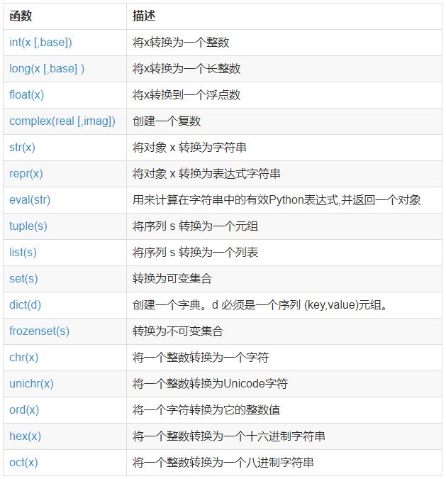 有时候,我们需要对数据内置的类型进行转换,数据类型的转换,你只需要将数据类型作为函数名即可。以下几个内置的函数可以执行数据类型之间的转换。这些函数返回一个新的对象,表示转换的值。