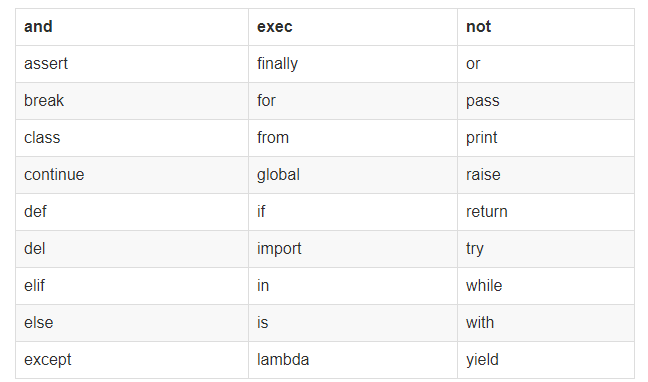 下面的列表显示了在Python中的保留字。这些保留字不能用作常数或变数,或任何其他标识符名称。