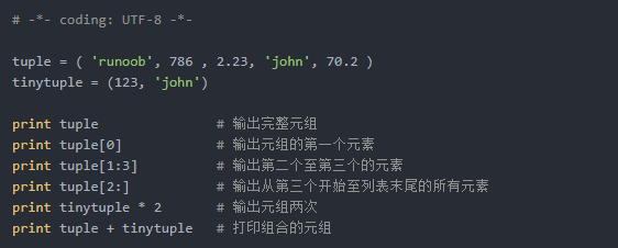 元组是另一个数据类型,类似于List(列表)。元组用"()"标识。内部元素用逗号隔开。但是元组不能二次赋值,相当于只读列表。