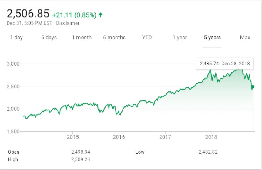 进入2019年之后,首先受到冲击的将会是美国股票资本市场,虽然2018年最后一周美国股市给投资人带来了一次缓解反弹,但整个市场仍然处于不稳定的状态,而且还要应对更高的利率。一些早期迹象已经表明2019年美国经济会持续走弱(可能是因为利率上升),当然我们在上文提及的华盛顿闹剧也有一定影响。以下是过去五年时间的标准普尔500指数变化趋势图: