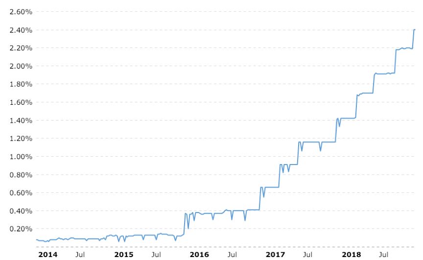 在过去的三年时间里,美国利率一直在逐步上升,三年前美联储的联邦基金利率(Fed Fund)基本为零,而现在已经增长到了接近2.5%。