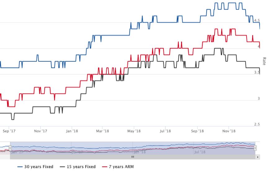 利率上升对消费者和企业影响很大,我预计2019年美联储仍然会继续提高利率。以下是美国最受欢迎的三种抵押贷款产品的利率变化趋势图: