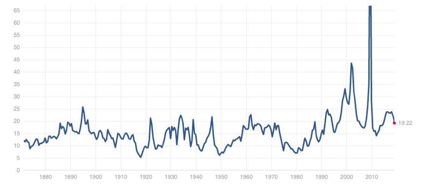我预计标准普尔500指数会在2019年间的某个时点跌到2,000点,然而在一整年中的大部分时间里都会围绕2,000点底部反复涨跌,这意味着标准普尔的动态市盈率(trailing PE)倍数会下降大约15倍,考虑道美国股票市场的近期历史表现,对我来说这基本上已经算得上是触底了: