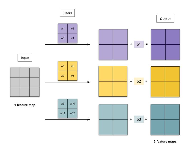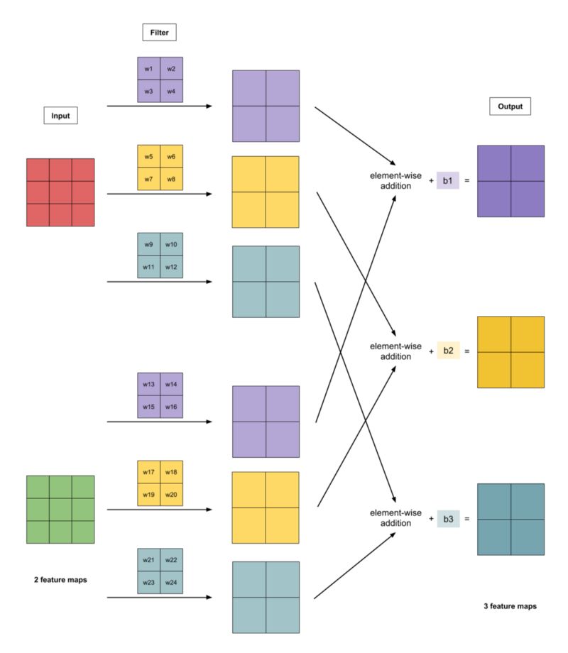 每一个输入特征映射有3个滤波器(紫色,黄色,青色)。产生的卷积按元素添加,并且向每个元素添加偏差项。 这给出了具有3个特征映射的输出。