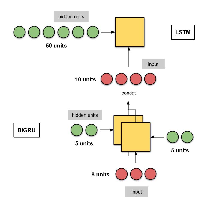 图2.2:一个堆叠RNN包含有BiGRU和LSTM层。该图形没有反映出实际的单元数。