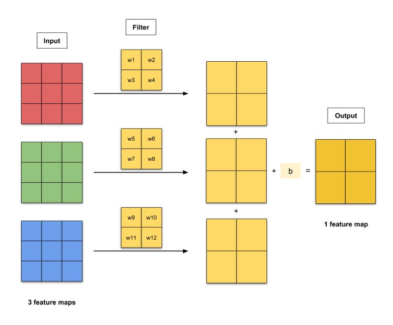 每一个输入特征映射都有一个滤波器。产生的卷积按元素添加,并且向每个元素添加偏差项。 这给出了具有一个特征映射的输出。