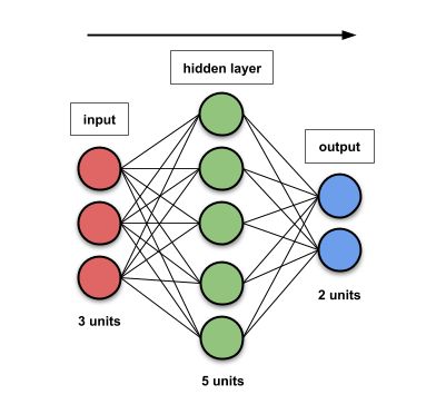 图1.1:输入大小为3,隐藏层大小为5,输出大小为2的FFNN。图形反映了实际的单元数量。