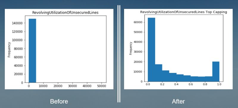 接下来处理异常值。总体来说,需要根据异常的类型进行处理。例如 如果异常值是由机械错误或测量导致的,可以用缺失值的方法进行处理。在这个数据集中有很大的数值,不过这些值看起来都很合理,所以取top/bottom coding。图3中表明当采用top coding后,数据分布看起来更接近于正态。