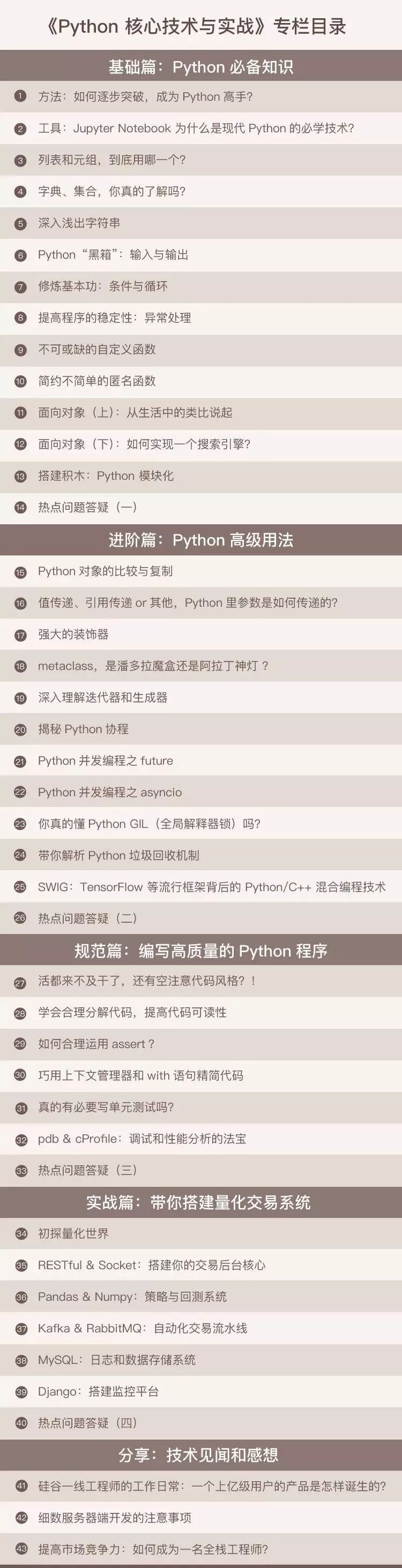 另外,专栏里的所有内容都基于 Python 最新的 3.7 版本,其中有大量独家解读、案例,以及不少我阅读源码后的发现和体会。同时,在层次划分上,我希望能难易兼顾,循序渐进。专栏中既有核心的基础知识,也有高级的进阶操作,尽量做到“老少皆宜”。