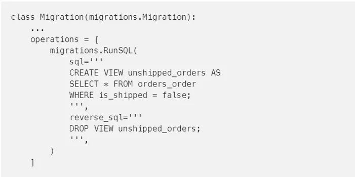 向Django添加额外数据库功能的另一种方法是编写自定义迁移。在Django获得对自定义约束和索引的支持之前,在自定义迁移中使用RunSQL是向数据库添加这类选项的一种方法。另一种可能性是使用RunSQL向数据库添加自定义视图,并将其作为一个模型公开: