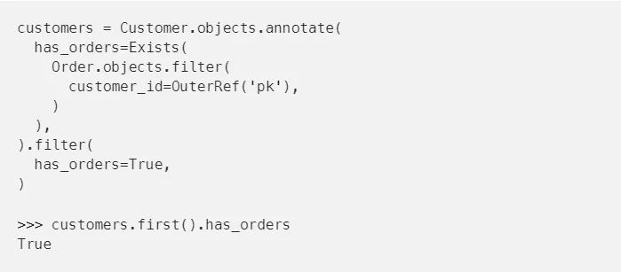 除了从另一个QuerySet中选择一个特定的值,我们还可以使用Exists类检查另一个对象是否存在: