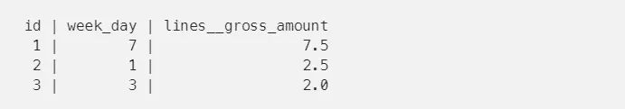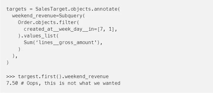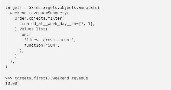 在本例中,我们可以使用默认可用的Django基本类型生成这个查询,但是如果我们想要聚合一些行,而这些行中没有惟一的东西可以进行分组,该怎么办呢?我们不能在子查询中使用aggregate,因为它会立即运行数据库查询。相反,我们需要做的是在ORM周围使用一些技巧。假设我们有这张订单表,并想计算所有周六和周日的总销售额:
