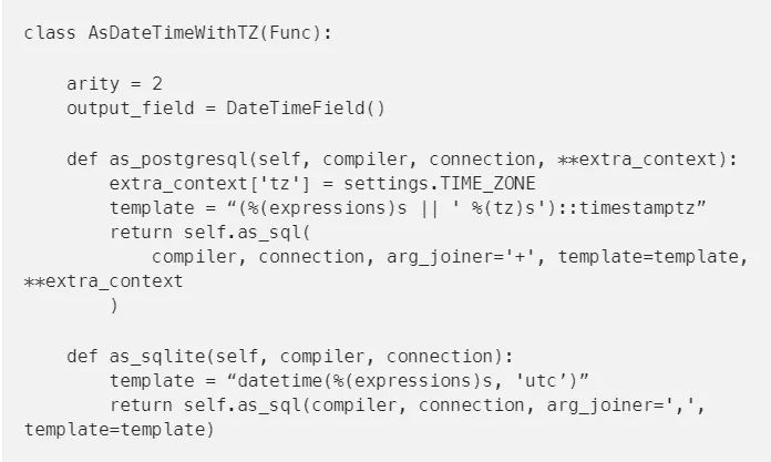 我们也可以用更复杂的函数来扩展。假设我们用单独的日期和时间列建立了一个模型,但是需要将其与使用日期时间的另一个表进行比较。我们可以通过实现一个自定义函数来实现这一点。没有跨数据库的通用方法可以做到这一点,但是Django允许我们为想要支持的每个数据库分别实现这一点。下面是用于PostgreSQL和Sqlite的例子: