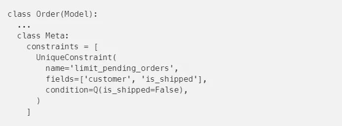 在本例中,我们将每个用户限制为只有一个未发货订单。虽然这可能是一个相对简单的例子,但是条件唯一性约束给了我们很大的灵活性。假设我们有一个数据库表,其中我们希望只允许一行具有NULL值。因为在SQL中NULL是不等于NULL的,所以每一行都被认为是惟一的,我们不能使用一个普通的unique=True或unique_together来限制这一点。但是,我们可以添加一个约束,在字段为NULL的情况下检查它是否是唯一的。