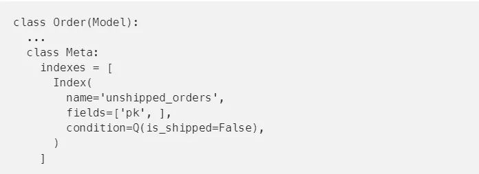 类似地,我们可以创建自定义的部分索引,它只覆盖表的一部分。如果只查询表的一个子集,或者表的很大一部分包含空NULL值时,这将非常有用。在我们的示例模型中,在准备发货时,我们很可能会频繁地访问未发货的订单。下面是如何创建只包含未发货订单的索引的示例。这将有助于加快我们最常用的数据库查询: