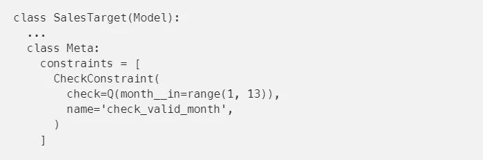 我们还可以创建自定义检查约束。这类似于Django中的字段验证器,但是它们是由数据库执行的。这可以保护我们不受Python代码中的bug的影响,该检查甚至可以在bulk_create和类似的平台上运行,如果你从另一个非django项目访问相同的数据库时,该检查也会运行。例如,我们可以创建一个检查约束来验证给定的月份数字是否有效: