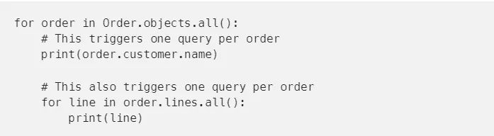 为了避免这种情况,你可以使用select_related和prefetch_related。它们有着非常相似的名字和行为。第一个用于获取数据库中的对象,这些对象每一个都和一行相关联,并生成一个JOIN查询,其中所有相关对象都在一个SQL查询中获取。当你的数据库中每一行拥有多个相关对象时,你可以使用第二种方法。它将首先获取原始QuerySet的所有对象,而不是创建一个JOIN查询。然后,它将运行第二个查询来获取所有相关对象,然后在Python中而不是数据库中来连接它们。因此,通过在我们的Orders QuerySet中添加以下两行代码,我们最终会得到两个查询: