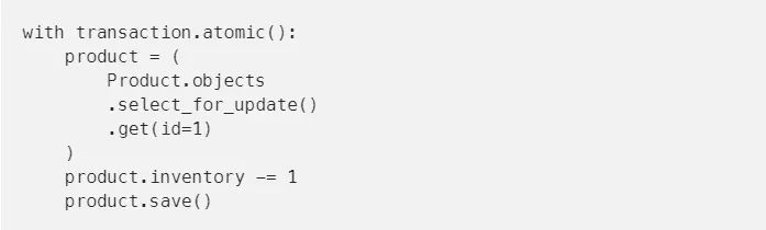 如果你正在处理数据库中的对象,这些对象可以通过多个请求并发地进行修改,那么你需要确保这些更改是按照正确的顺序应用的。这可能很重要,例如,如果我们在产品模型上保持库存数量,我们希望确保该数量正确地递增和递减。对此的一种解决方案是,当我们从数据库中获取对象时,对数据库中的行进行锁定。这样,我们就可以保证不允许其他请求获取和修改相同的行。