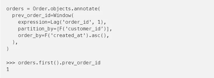 在Django2.0中,使用DjangoORM运行窗口函数进行查询得到了支持。这将在查询中生成一个OVER语句来查看行分区。这是很有用的,例如,如果我们想查找某个客户的上一个订单,查看该客户上一次下订单的时间,或者计算来自该客户的订单总和。下面是一个示例,演示如何使用来自同一客户的上一个订单的id来注释一个订单的QuerySet: