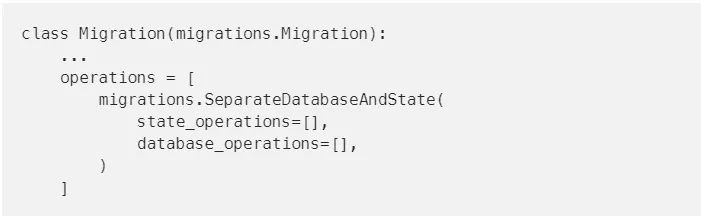 我将向你展示的与迁移相关的最后一个基本类型是SeparateDatabaseAndState类。Django在运行迁移时,除了数据库中的实际状态外,还保留一个内部状态来表示模型的预期布局等。使用这个类,你可以分别修改这两个状态。如果你需要将这两者分开,例如出于高可用性的原因,这个类将非常有用。这就需要用到列表,一个在内部状态下执行操作,一个在数据库中执行操作: