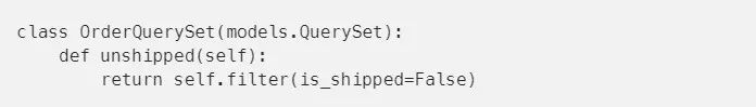 我们在Kolonial.no上大量使用的东西是为我们的模型定制的Manager(管理器)和QuerySet(查询集)。在这里,你可以保持与你的模型相关的可重用逻辑。例如,我们可以在订单QuerySet中添加一个方法,该方法给出一个未发货订单的列表: