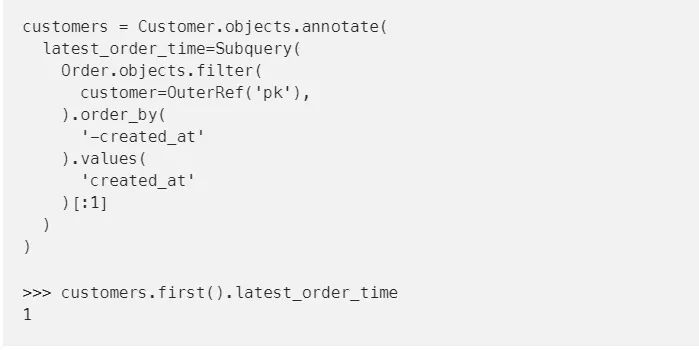 这里两个有趣的部分是Subquery和OuterRef类。第一个是一个包装器,它接受一个普通的QuerySet并将其作为子查询嵌入到另一个QuerySet中。OuterRef类用于引用嵌入子查询的QuerySet中的字段。在本例中,我们使用它进行筛选,以便只获得属于当前行客户的订单。然后按日期排序,只选择日期列,然后只返回第一个结果。