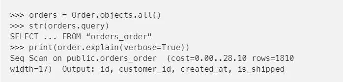 另一个需要知道的有用技巧是如何检查一个QuerySet。假设你想知道为什么一个特定的QuerySet不能准确地返回你所期望的结果。那么,打开一个shell并实际检查数据库中正在运行的查询是非常有用的。这里我特别想强调两件事: 如何查看某个QuerySet生成的SQL查询,以及如何在数据库中运行一个EXPLAIN查询。