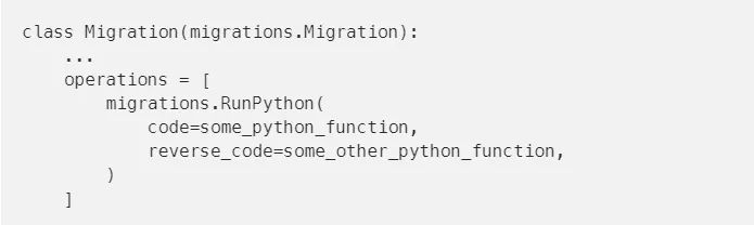 自定义迁移的另一个用例是数据迁移。如果你的数据库中有一组始终可用的初始数据,那你可以使用数据迁移将其添加到自定义迁移中。如果你在运行测试时使用迁移,那么相同的初始数据集也将在测试中可用。要做到这一点,你可以在你的迁移文件中使用RunPython类: