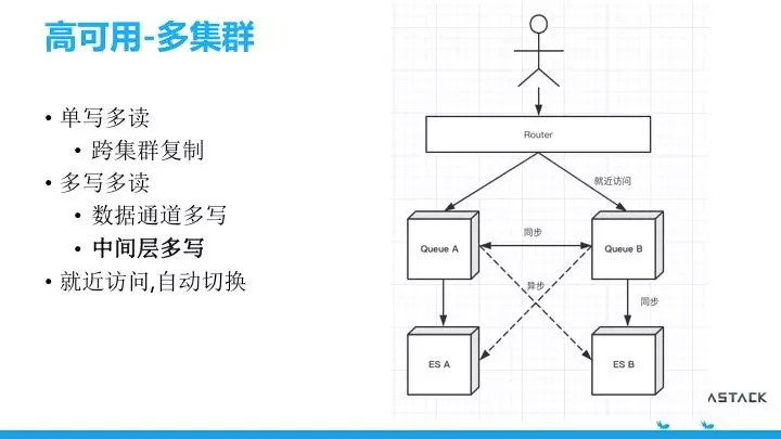 正如我之前提到那样,ES 本身其实提供了跨机房部署的方案,通过打标就可以进行跨机房部署,然后通过preference可以保证业务就近查询。我这里就不再详细说了。