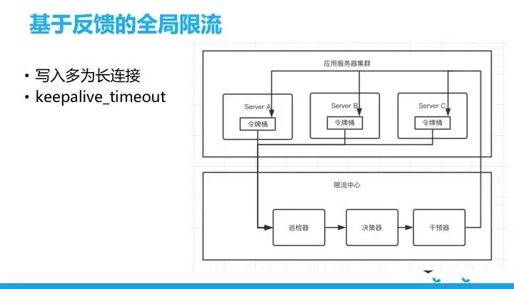 既然是令牌使用不均衡,那么我们就让其分配也不均衡就好了呗。所以我们采用了一种基于反馈的全局限流方案。什么叫基于反馈呢?就是我们用巡检去定时采集用量,用的多就多给一些,用的少就少给一点。