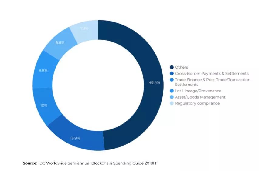 这些投资将由金融服务部门主导。2019年最为广泛采用的案例是跨境支付和结算,这两项的投资金额超过4.5亿美元。