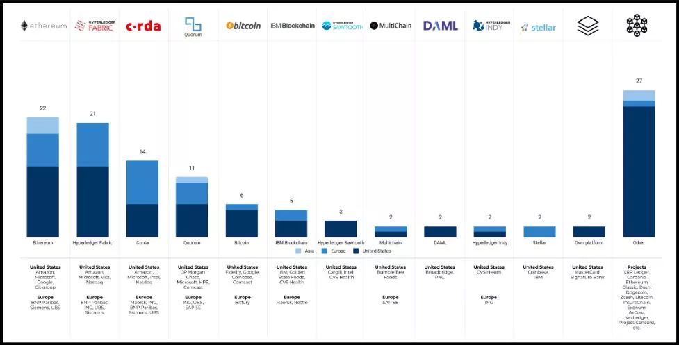 50强企业中最有趣的趋势是:几乎所有公司都会搭建多个区块链技术平台。尽管这些公司最终可能会专注于开发一种单一的技术,例如蚂蚁财富或甲骨文,但很明显,他们也会通过多个平台进行对冲。