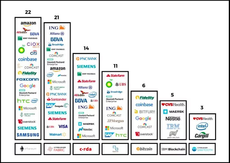 这份榜单包括:Allianz SE、Amazon、Anheuser-Busch InBev、蚂蚁金服、BBVA、Bitfury、Cargill、花旗集团、Coinbase、Facebook、Fidelity、富士康、Google、HTC、IBM、ING、英特尔、摩根大通、马士基、微软、纳斯达克、Oracle、Ripple、三星、SAP SE、西门子、VMware、沃尔玛等。
