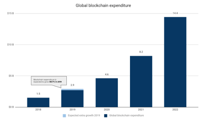 IDC预测,全球区块链开发支出预计将增长88%,从2018年的15亿美元增长到今年年底的29亿美元。预计到2022年,总支出每年将进一步增长76%,达到144亿美元。